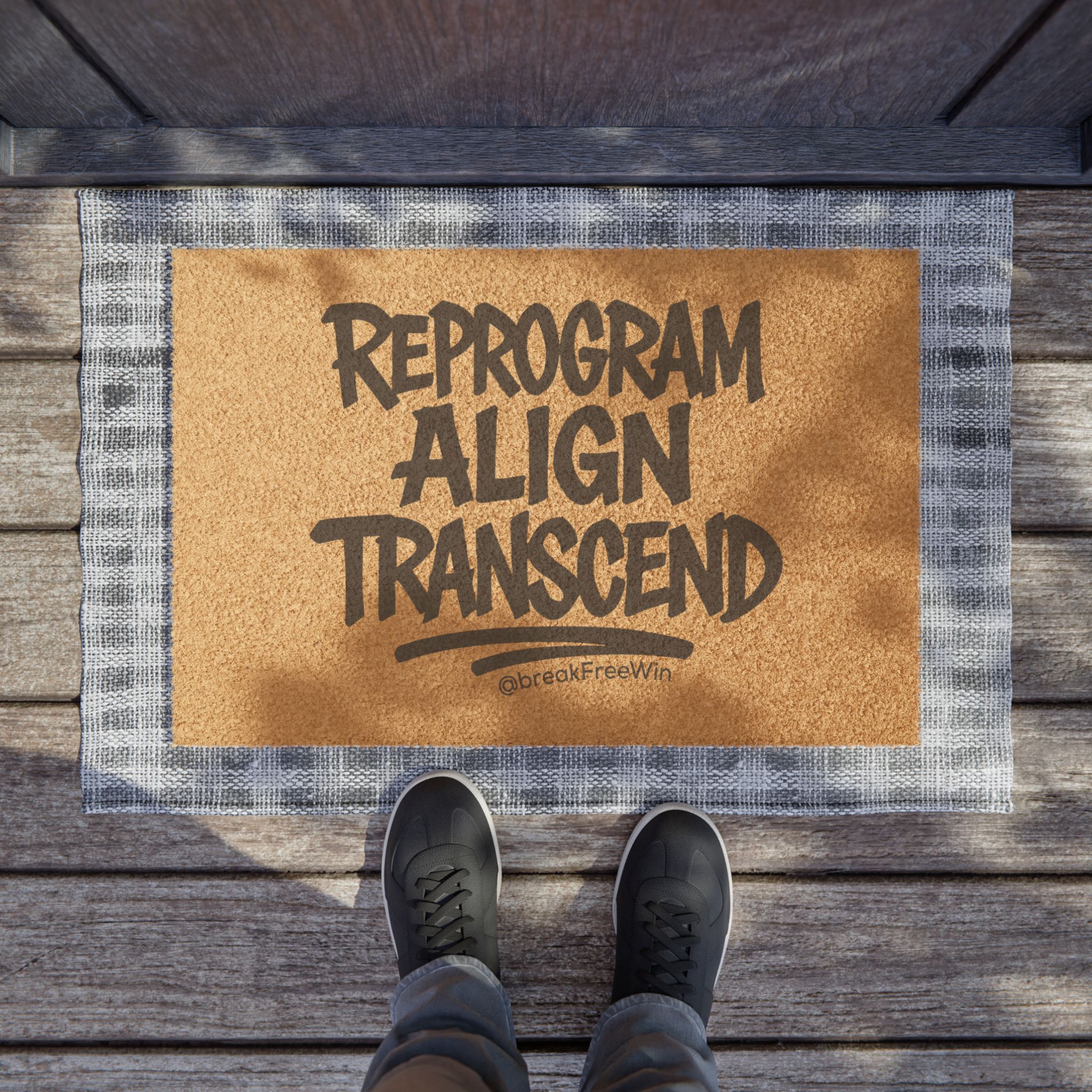 Step onto words that set the tone. This sturdy coir doormat greets guests with bold, hand-lettered text — a brief mantra that feels like a breath before you cross the threshold. The natural coconut fibers scrape dirt and dry shoes, while the textured black vinyl backing keeps the mat anchored on porches or entryways. Weather-ready and low fuss, it brings a little personality to outdoor spaces and invites a mindful pause before entering home life.